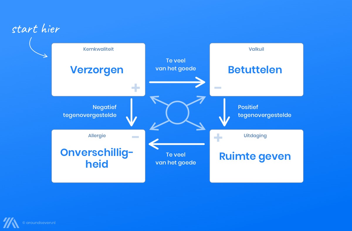 Wat zijn de valkuilen voor jullie organisatie? De kernkwadranten van Daniel Ofman kunnen hierbij helpen. Hierbij ga je uit van de belangrijkste kernkwaliteit en bedenk je wat er zou gebeuren als je teveel daarvan had. Vervolgens kijk je naar het positief tegenovergestelde daarvan. Als je dat hebt gedaan bedenk je wat het zou betekenen als je daarvan dan weer teveel had. In onderstaand is de valkuil van de organisatie betuttelen.